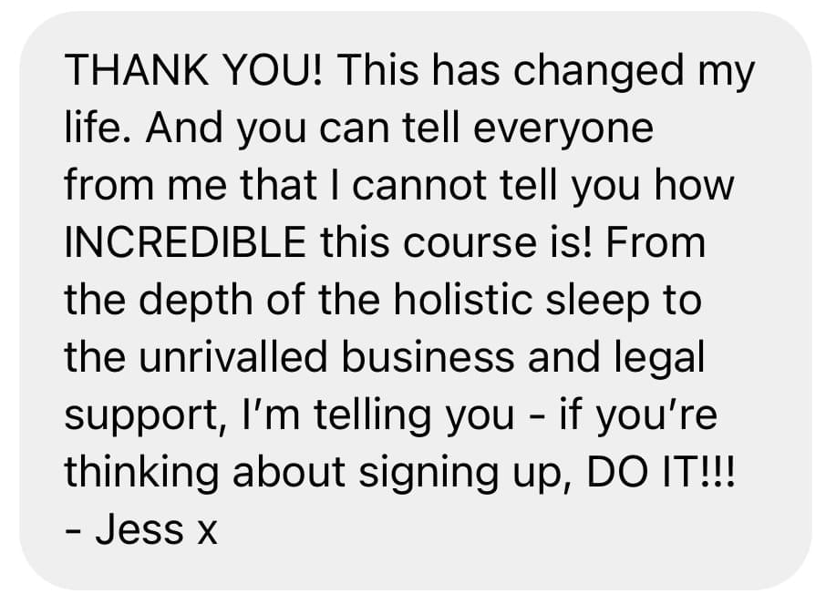 It is one of a kind in this two-pronged approach, with tried and tested successful methodologies created by an established holistic sleep coach and qualified lawyer, with experience consulting for other leading sleep coaches to help THEM grow THEIR businesses. So you're in super safe hands!