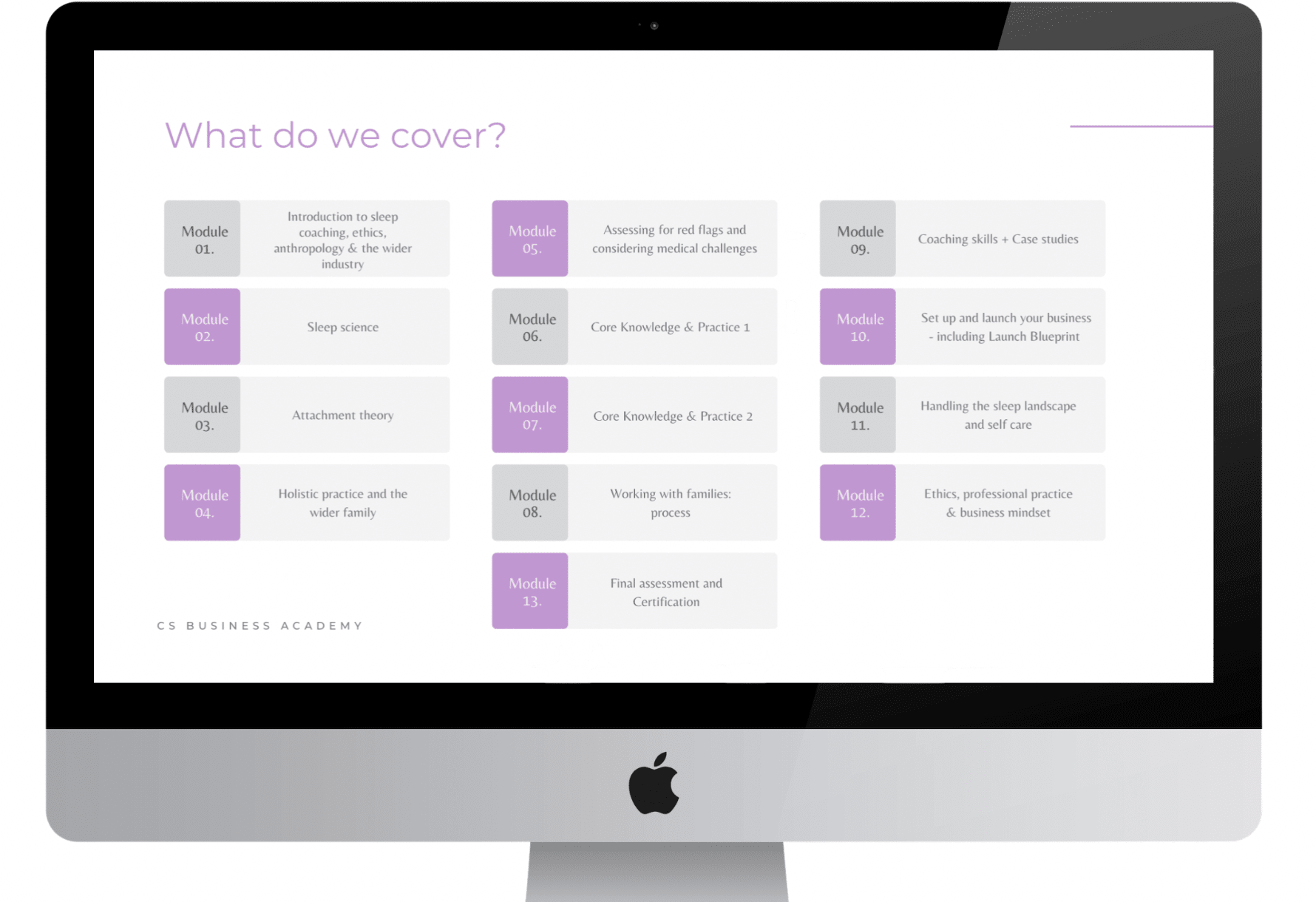 All 12 modules (and 13 if you count the Final Assessment!) are completely self-paced. You can complete these entirely in your own time, from your laptop or even an app on your phone while holding a baby if you like!